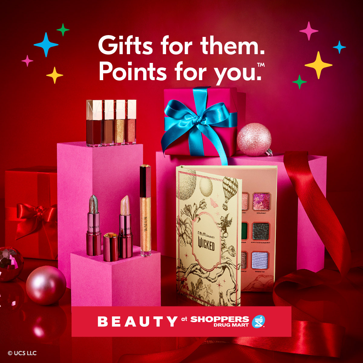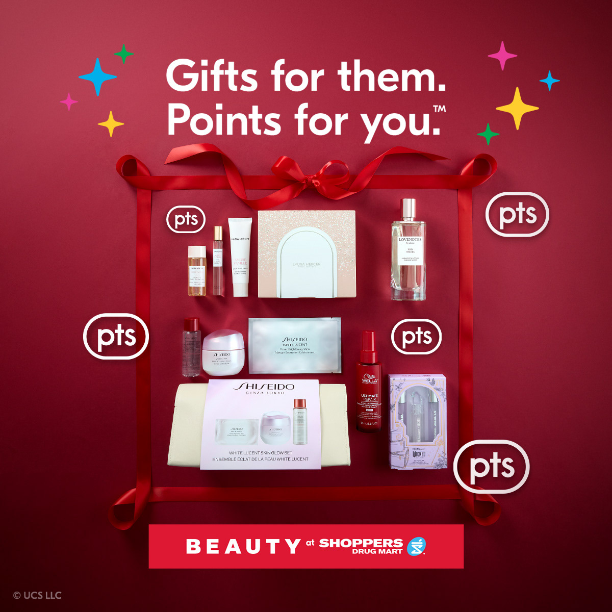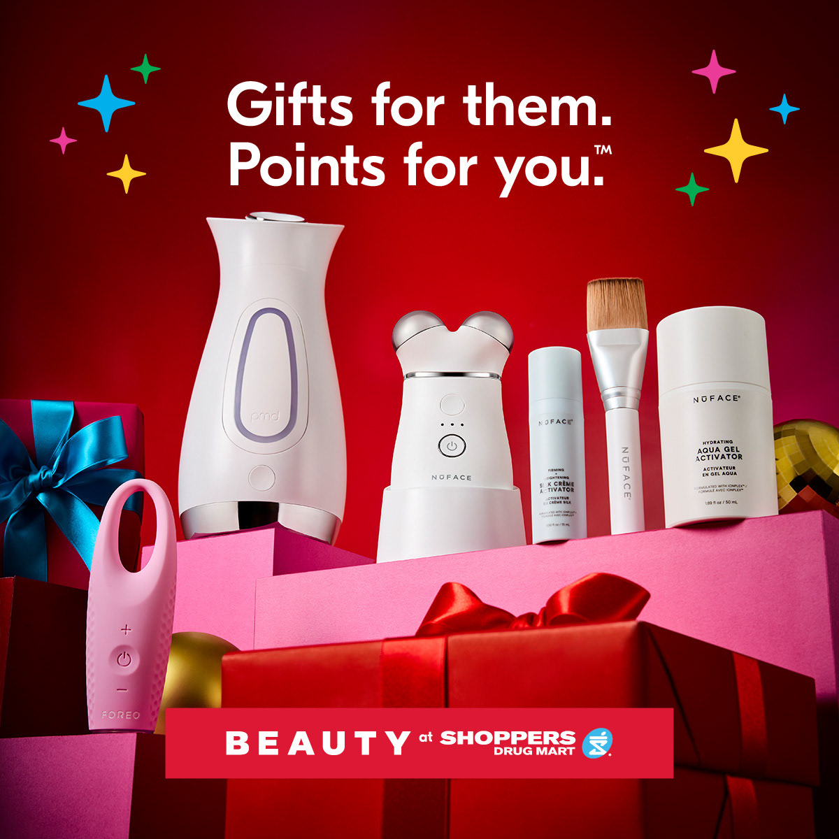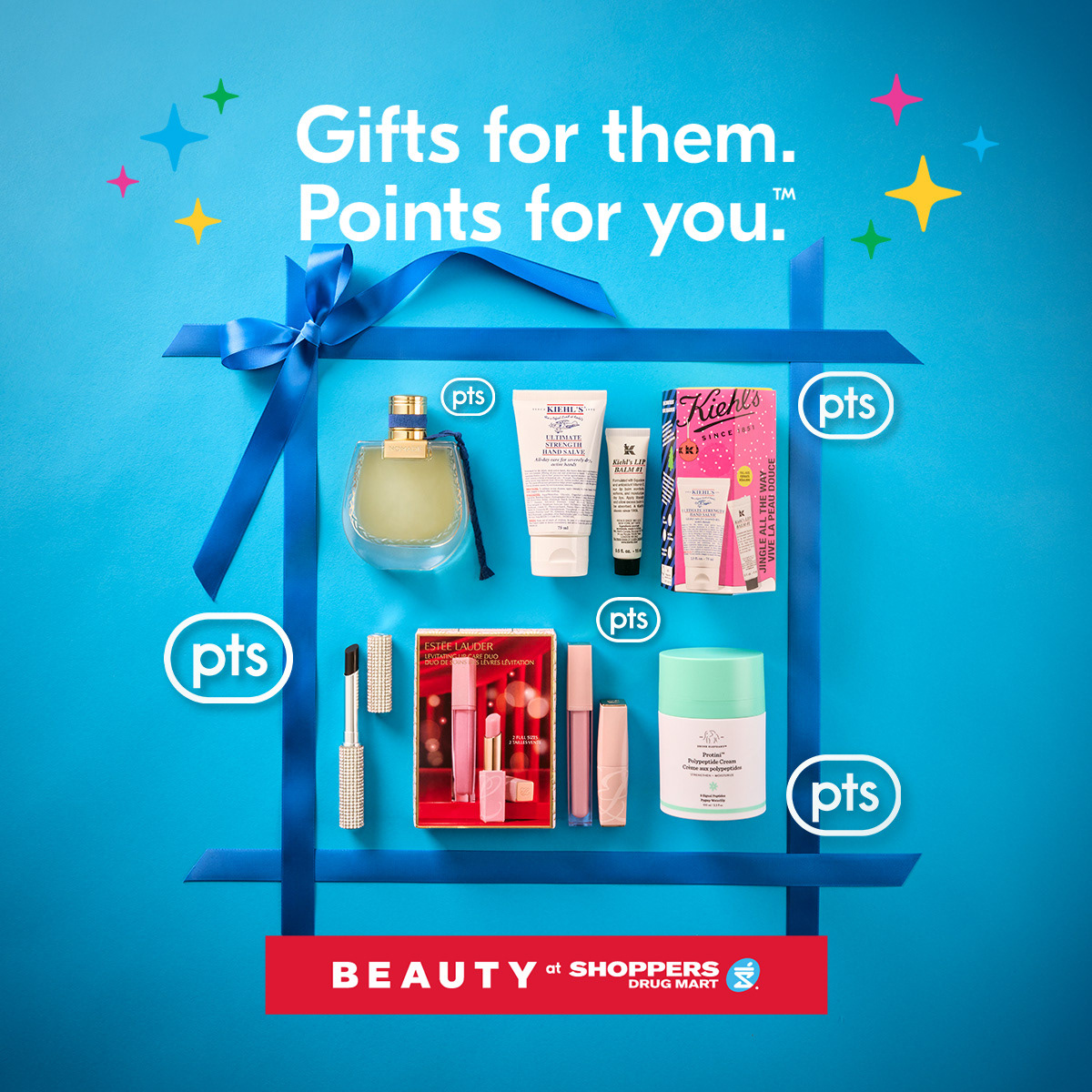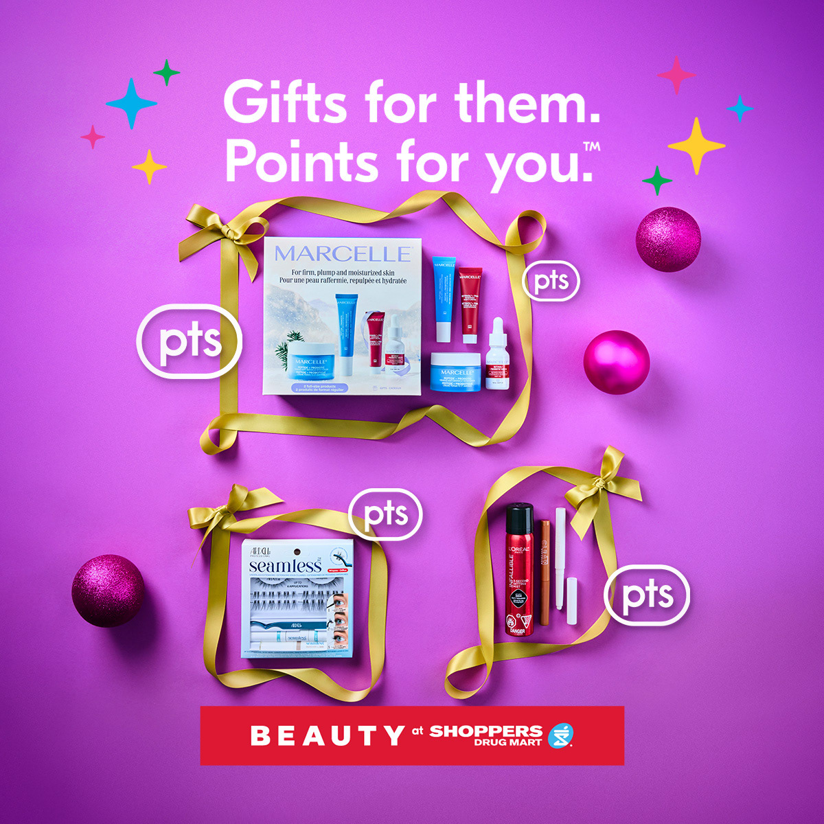 This creative series communicates the campaign’s key message, “Gifts for you. Points for them.” It features a range of products laid out in a gift-box–shaped ribbon, with PC Optimum points visually popping out of the frame.